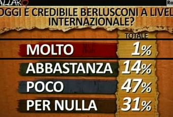 Come si può vedere dall'immagine qui sopra, che riporta i risultati del sondaggio Ipsos, appena il 15% degli italiani crede che il Presidente del Consiglio Silvio Berlusconi sia ancora credibile a livello internazionale; mentre per il 78% lo è "poco" o "per nulla".