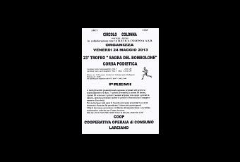 SI INIZIA a correre anche di sera ed uno dei primi appuntamenti è fissato per venerdì a Colonna di Larciano dove si terrà il 23° Trofeo “Sagra del Bombolone” organizzata dal Circolo di Colonna in collaborazione con la locale società di atletica. Due i percorsi a disposizione: uno di 7 chilometri (competitivo e non) e l'altro di 3000 metri (non competitivo) con i podisti che si ritroveranno alle 19 al circolo di piazza Berlinguer da dove alle 20 partirà la gara.
