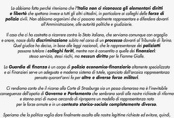 400 Finanzieri si ribellano agli obsoleti regolamenti militari ed allo specchietto per le allodole di una Rappresentanza Militare svuotata di ogni potere, chiedono pertanto maggiori tutele ed un sindacato che li rappresenti. Su questi due obiettivi - a prescindere dall'origine della loro protesta che può essere condivisa oppure no, in relazione alle opinioni che si hanno riguardo all'alta velocità ed all'inopportunità di militarizzare la Val di Susa - Il Movimento dei Finanzieri Democratici esprime solidarietà e vicinanza ai dipendenti della Guardia di Finanza.