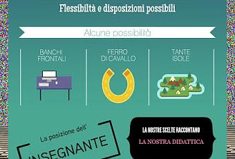 1. UNA DISPOSIZIONE FLESSIBILE: flessibiltà è la parola d'ordine. I banchi devono potersi spostare, dobbiamo poterli mettere da parte per fare un'attività al centro dell'aula o per dedicarci a un circle time particolarmente lungo; dobbiamo poterli mettere a isole per lavorare in gruppo; dobbiamo poterli lasciare frontali, per permettere di seguire meglio una spiegazione; possiamo metterli a ferro di cavallo se la discussione è alla base del nostro modo di insegnare. Se la sicurezza lo permette (bisogna chiedere ai responsabili della sicurezza, per adeguarsi all'aula in cui ci so trova), spostare i banchi tutte le volte che ci serve sarà utilissimo, sia per rendere il processo di insegnamento/apprendimento più efficace sia per dare ai bambini e ai ragazzi quel cambiamento che a loro serve per attivarsi e seguire con piacere una nuova attività.