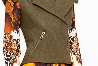 Anche nei tessuti si predilige l’effetto contaminazione, ove trionfano effetti materici su ampi cappotti oversize sottratti al guardaroba maschile dei militari e per i giubbini minimal che sembrano ricordare le armature dei samurai, in una alternanza di tessuti tradizionali a materie tecniche in straordinario equilibrio tra jersey stampato all over, panno di lana stampato e pizzo couture o del sablé di seta.