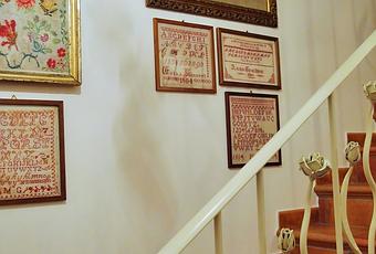 Lorena ha raccolto personalmente la collezione di imparaticci che e' disposta sulla scala che porta al piano superiore, inoltre e' lei che ha disegnato la ringhiera con le rose in ferro battuto ...motivo che troveremo in tutta la casa...