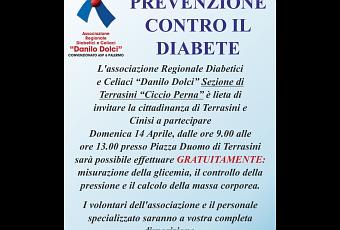 Domenica 14 Aprile dalle ore 9.00 alle ore 13.00 in Piazza Duomo a Terrasini, l’Associazione Diabetici e Celiaci “Ciccio Perna”, coadiuvata da personale specializzato, effettuerà degli screening gratuiti per la cura e la prevenzione del diabete. Presso il “gazebo della prevenzione” i cittadini potranno effettuare il controllo pressione, la misurazione dell’indice glicemico e il calcolo dell’indice della massa corporea. Per ulteriori informazioni 320 8696716