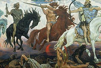 I Cavalieri dell’Apocalisse sono quattro figure simboliche introdotte nell’Apocalisse di Giovanni 6,1-8 e successivamente presenti nella cultura medievale, ma anche in quella contemporanea. Secondo molti esegeti essi rappresentano forze attive che sconvolgono la storia. In una lettura semplificata, molto diffusa, ognuno di essi sarebbe legato a un male che tormenta l’umanità e cavalcherebbero sulla terra il giorno dell’Apocalisse, dando inizio alla Fine del mondo. I loro nomi sarebbero: “Pestilenza, Guerra, Carestia e Morte”.
