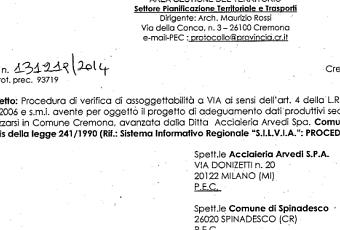 Il 18 novembre il dirigente del settore patrimonio dell’amministrazione provinciale Maurizio Rossi ha dato dieci giorni di tempo all’acciaieria Arvedi per presentare documenti che risolvessero i vari problemi d’impatto ambientale. Altrimenti la richiesta dell’industria siderurgica, di adeguare i dati di produzione (aumentati, grazie al nuovo forno fusorio), sarà rigettata secondo la normale procedura. L’Arvedi ha già presentato ricorso al Tar contro il piano di risanamento acustico: non è questo l’unico problema. Il dirigente provinciale si riferisce infatti anche all’aumento delle emissioni in atmosfera, all’impatto energetico, al