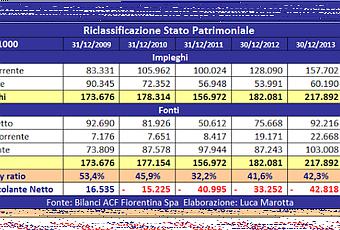 ACF Fiorentina Spa ha chiuso il bilancio d'esercizio al 31/12/2014 con una perdita netta di € 37 milioni di Euro. Mentre, l'esercizio solare 2013 si era chiuso con un utile di Euro 1.448.376 e il 2012 con un utile pari a Euro 1.155.691.