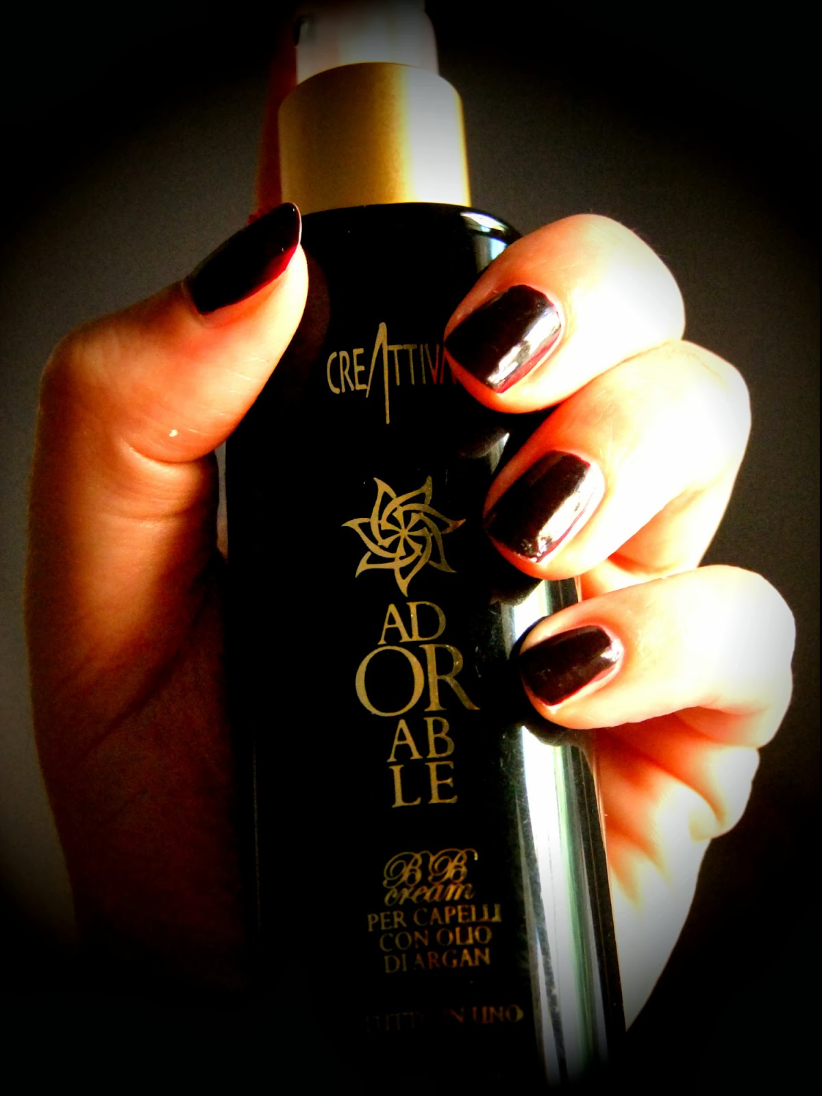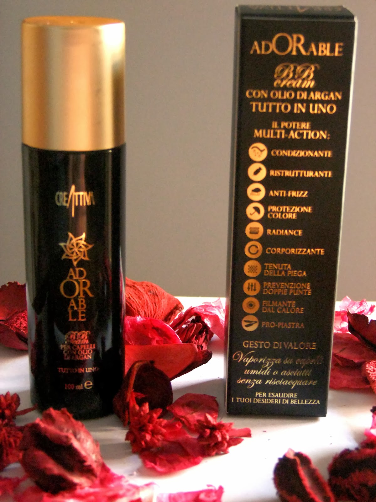 Buongiorno amici/che ,voglio parlarVi della mia ultima scoperta, presentandovi Adorable, la prima BB cream per capelli. Adorable fa parte della linea Oro del Deserto di Creattiva Professional, di cui fanno parte anche ArganBain, ArganMask e ArganOil. La linea Oro nel deserto è stata creata per soddisfare le esigenze di tutti i tipi di chiome che non vogliono passare inosservate e che vogliono essere perfette in un solo gesto e di cui Adorable BB Cream è l’elemento clou: trattasi di una crema intensiva a base di olio di Argan, caratterizzata da una profumazione delicata, in grado di donare un’ intensa azione ristrutturante e nutriente nonché protettiva e lucidante. BB Cream è una crema senza risciacquo, dalla texture leggera, portare sempre con sè grazie alle dimensioni mini e da utilizzare per ogni tipo di esigenza : condizionante, ristrutturante, anti-frizz, protezione colore, radiance, corporizzante, tenuta della piega, prevenzione doppie punte, filmante dal calore e pro piastra. BB Cream di Creattiva Professional basa la sua efficacia sulle proprietà dell’Olio di Argan in sinergia con Keratina Idrolizzata, Proteine del Grano, del Riso e della Seta, che esercitano sul capello un’intensa azione ristrutturante e nutriente nonché protettiva e altamente illuminante. Con BB Cream i capelli appaiono istantaneamente idratati, incredibilmente corposi, sani e forti, il colore è intenso ad effetto radiance, le punte sono levigate. Vaporizzare sui capelli umidi Adorable su tutta la capigliatura distribuendo uniformemente. Procedere con lo styling desiderato. In qualsiasi momento della giornata erogare sul palmo della mano e distribuire con un leggero massaggio sui capelli. Ideale per ravvivare lo styling, per illuminare i capelli e per levigare le doppie punte.