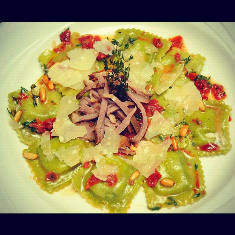 Il nostro menu è basato principalmente sulla pasta fresca, in particolare ravioli fatti in casa. Abbiamo in menu qualcosa di simile ai casoncelli ma cucinati con funghi freschi saltati e olio di tartufo. Ci sono poi le orecchiette alla pugliese con broccoli al posto delle cime di rapa, qui impossibili da trovare, e gamberetti. E ancora gnocchi fatti in casa ai quattro formaggi, panna, brandy e pistacchi tostati.