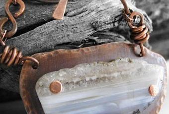 Questa fettina di geode di agata era assolutamente imperfetta, con due grandi fori asimmetrici, ma aveva la forma e il colore di una nuvola. Ho ritagliato attorno ad essa la sua forma irregolare. E ho completato questo semplice pendente con una catenina fatta a mano da piccoli elementi a 8. La chiusura a T è anch'essa completamente fatta a mano.