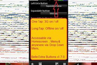 - Nuove funzionalità per tutti i device Belle: accesso a otto funzioni precaricate tramite i pulsanti non visibili nel riquadro di stato nella schermata Home, Menu e ovunque tramite Drop Down Menu. Quando si apre Extra buttons compaiono 4 rettangoli colorati sulla parte superiore dello schermo, ognuno con due funzioni: