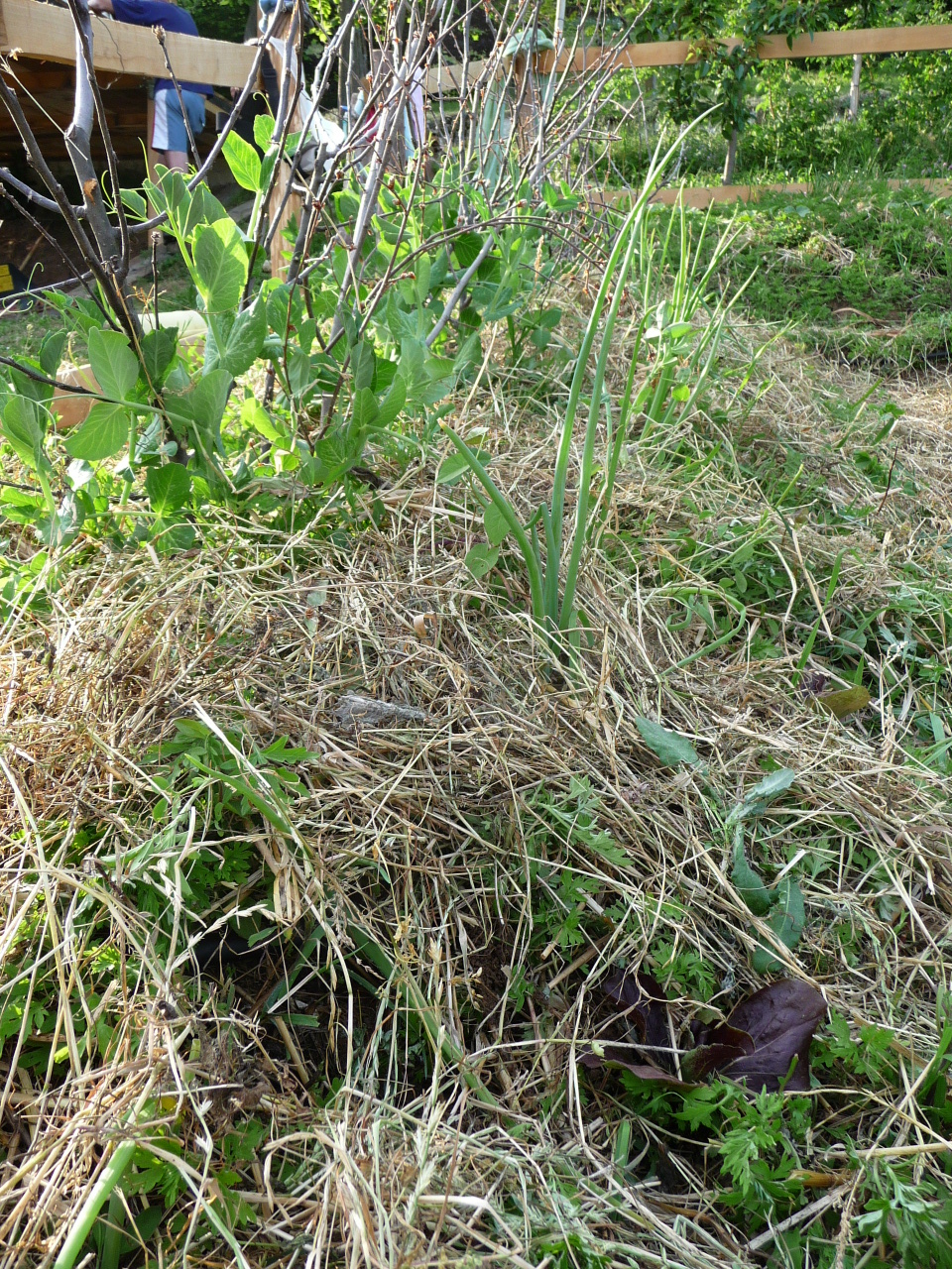 Ecco alcune immagini della progressione nostro piccolo orto sinergico. Il lavoro principale al momento consiste nel strappare infestanti e pacciamare (quindi procurarsi pacciame), piantare e seminare a seconda dei gusti, della luna, dello spazio disponibile e con un occhio alle consociazioni.Qui sotto potete intravedere i piselli vicino alle cipolle rosse di tropea.In un angolo dell'aiuola c'è anche il tagete.A sostegno dei piselli ho messo rametti recuperati da potature. Per completare al consociazione leguminosa+liliacea+verdura ho aggiunto della cicoria intorno all'aiuola.Si vede un pò la foglia scura in basso a destra, nella foto sotto.Francamente la cicoria dopo una settimana dal trapianto mi sembra un pò in sofferenza, alcune sono marcite. Devo allargare la pacciamatura intorno, forse.