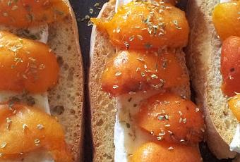 Sul formaggio brie appoggerai delle albicocche mature, maturissime anzi, divise in quattro e finirai con una spolverata di origano rigorosamente calabrese.