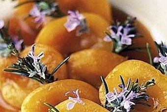 - Disponete le albicocche sul piatto di portata, versatevi sopra lo sciroppo, completate con il rosmarino in fiore e servite.