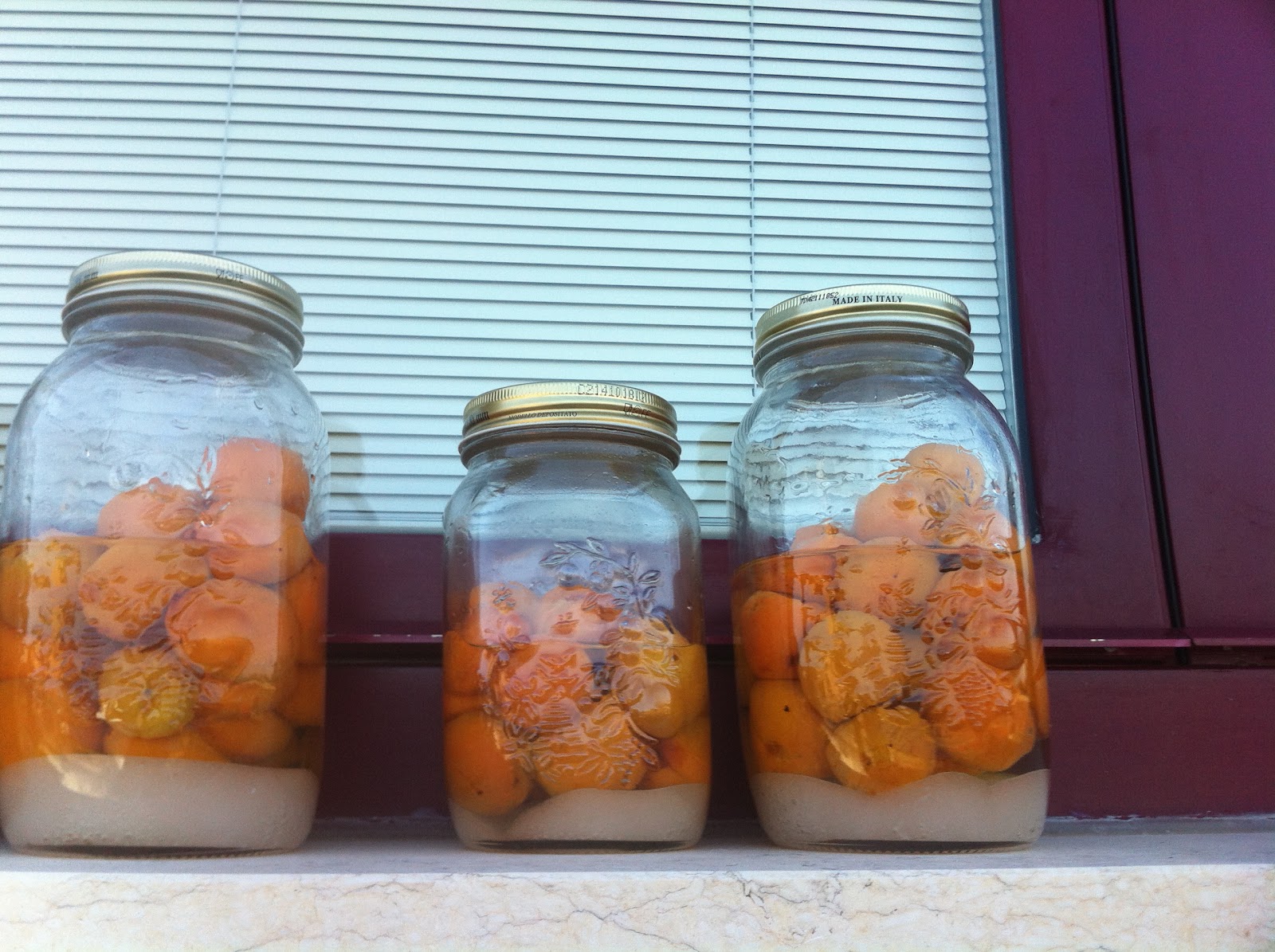 Visto il grande caldo che faceva i giorni scorsi ho pensato di sfruttare il sole quindi sono nate queste albicocche al naturale e nel prossimo post vi presenterò le albicocche essiccate.Ingredienti Albicocche Zucchero Grappa (opzionale) Procedimento Prendere le albicocche e lavarle con cura aggiungendo anche un pochino di bicarbonato. Poi lasciarle asciugare su un canovaccio. Quando saranno asciutte metterle in barattoli di vetro e coprirle con la metà del loro peso di zucchero e mezzo bicchierino di grappa. Chiudere e mettere al sole per almeno 15 giorni.