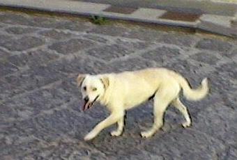 E vagando con l'occhio perso nella fatica lo vedo: un cagnetto bianco che sale anche lui; solo che, mentre io salgo a sinistra della strada, lui sale a destra.