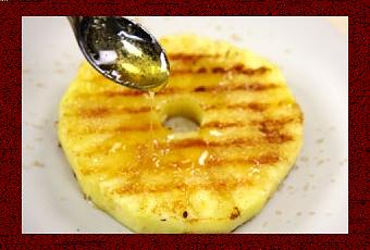Togliete l’ananas dalla piastra e adagiate le fette su di un piatto da portata. Condite con zucchero di canna, miele e una leggera spolverata di cannella.