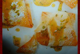 sfornate i fagottini spolverizzateli di zucchero a velo e serviteli con miele e pistacchi