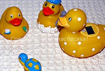 Stamani primo bagnetto dell'anno, completo di lavata di capelli e taglio della frangetta troppo cresciuta. Conclusione della mattinata con acconciatura speciale completa di due codine laterali che fanno il viso furbo furbo. Durante l'operazione asciugatura e acconciatura, le paperette della vasca sono state accuratamente asciugate dalle manine amorevoli di Micro, per poi animarsi nuovamente sul tappetino del bagno a raccontare storie incantevoli ed avventure mirabili."Ora mettiamole a nanna al loro posto, su, cosi' andiamo giu' a leggere e giocare....""No, mamma, anche paperette vuoliono uscire!"
