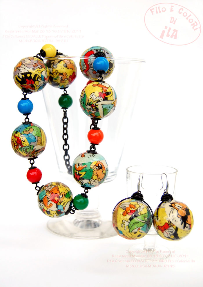 Da cosa comincio? Dalle cose belle o da quelle brutte?Da quelle belle, almeno se non avete voglia di cuccarvi tutto il post (cosa più che comprensibile) ho la possibilità di mostrarvi comunque le ultime creazioni.Ho lavorato ancora sulla serie ECOBALLE (mio marito si sta facendo una cura di birra scura per procurarmi le utili pallette!) questa volta decorate con la carta di un Topolino del 1984, precisamente con la storia Paperino e la casa elettronica;con cui ho creato anello, orecchini e collana... tutti già in giro a Roma e a Portici, indossati da due favolose fanciulle.