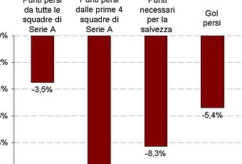 La situazione in coda alla classifica è difficilmente comparabile tra le ultime due stagioni, in virtù del disgraziatissimo campionato del Parma. Tuttavia nel 2013-2014 a dieci giornate dalla fine erano necessari 24 punti per essere virtualmente salvi mentre oggi ne basterebbero solo 22. Quest’anno quindi sarà plausibilmente più bassa anche la quota salvezza.