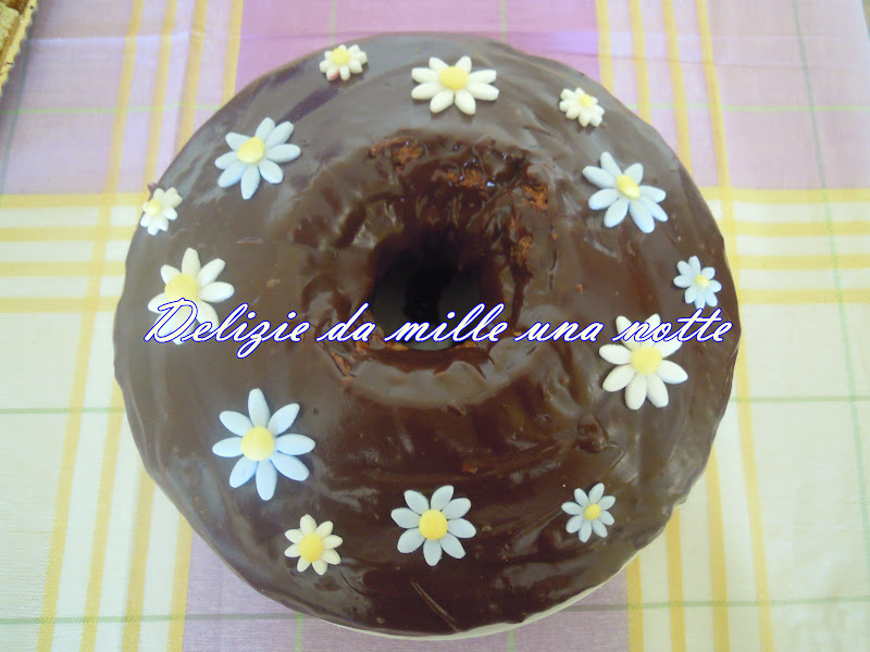 A questo punto preparare la ganache al cioccolato: tritare grossolanamente il cioccolato, scioglierlo a bagnomaria, togliere dal fuoco, aggiungere la panna ed amalgamare il tutto, versare sulla torta. Io poi l'ho decorata con dei fiorellini in pasta di zucchero.