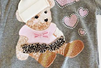 Gli inserti maculati sono molto discreti e sono presentati assieme ad altri frills che nell'insieme donano un tocco femminile e tenero come il fiocco rosa sul retro e l'orsetto stampato sul davanti.