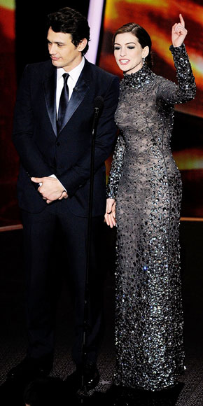Poco dopo si è esibita in un divertente numero musicale dove prendeva in giro Hugh Jackman, il presentatore dello scorso anno, che aveva coinvolto l'attrice in numero di ballo e canto. Un tuxedo di Lanvin, pump di Brian Atwood e una bella coda alta è stata una bella scelta per farle vestire i panni "della presentatrice". James Franco per bilanciare la situazione...si è vestito da Marilyn!