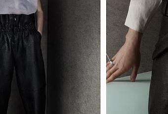 L'interno emerge, come per osmosi, esternamente mettendo a nudo imbottiture e cuciture lasciate crude, lembi sfilacciati che si frappongono tra lo sguardo ed il capo, sul corpo, in un suggestivo e quantomai perfetto non finito. Linguette di plastica (strumenti di contenzione ospedaliera o semplicemente strumenti idraulici) utilizzate sia come listello-scarpa sia come braccialetti: capricci estetici in una palette di colori che va dal vino al grigio, al vaniglia, al rosa, al blu e al bianco.