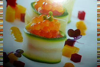sormontate i nidi di zucchina con le uova di salmone e decorate il piatto con salsa di mango i cubetti di mango e barbabietola tenuti da parte pezzetti di germogli e petali di fiori