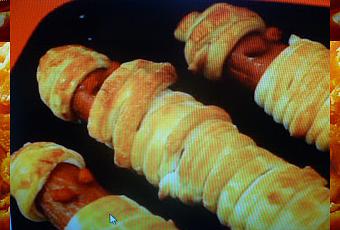 stendete la pasta sfoglia con l'aiuto di poca farina tagliate strisce lunghe 0,5 cm che sarebbero le bende della mummia avvolgete la pasta intorno al wurstel facendone se volete in altro il cappello