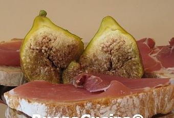 Lavo i fichi, li asciugo e li taglio in a metà . Taglio a fette sottili il prosciutto crudo e le dispongo su di un piatto da portata con al centro i fichi e servo con fette di pane casereccio, oppure mettendo nel centro del piatto i fichi e tutt’attorno i grissini con arrotolato sulle punte le fette di prosciutto.