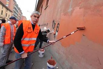 L’onorevole Casini pulisce le scritte dai muri di Bologna. Da notare il colore usato molto diverso dall’originale e l’uso del rullo. La sottoscritta aveva impiegato, per ripulire il muro del nostro Municipio, un pigmento a calce il più vicino possibile alla tonalità precedente (impossibile trovarla identica) e usato un pennello per mantenere la traccia delle velature tipiche del colore a calce. Chissà se il Comune di Bologna lo denuncerà?