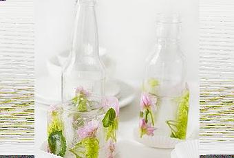 Decorazione estiva per bottigliette di vetro + ghiaccio e fiori.Tagliare la parte superiore di una bottiglia di plastica da 1 litro, Riempitela quindi con acqua, inserendo i fiori ...ma volendo anche le foglie, i rametti di erbe, qualche bacche e la frutta e fette, inserisci ora la tua bottiglia di vetro,e poni accuratamente il tutto nel freezer, lascia per qualche ora così che tuttosi congeli intorno alle bottiglie. Quando dovete servire, è sufficiente mettere tutto sotto il rubinetto per far scivolare fuori la mezza bottiglia di plastica tagliata dall'altra in vetro.Riempite la vostra bottiglietta così decorata con cocktail estivi... e servite Buon aperitivo estivo!foto via http://sweetpaul.typepad.com/my_weblog/2010/04/so-how-is-the-magazine-going-sweet-paul.html