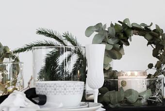 Un tavolo in legno grezzo lasciato a vista cattura subito lo sguardo e per creare un piacevole contrasto l’apparecchiatura è fatta con accessori rigorosamente moderni e raffinati, proposti in bianco e nero. Per le decorazioni sono state inserite al centro della tavola solo alcune candele e dei vasi in vetro trasparente decorati con fili luminosi, rami di pino e di eucalipto.