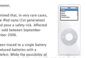 “Caro proprietario di iPod nano, Apple ha stabilito che, in casi molto rari, la batteria nel iPod nano (1a generazione) potrebbe surriscaldarsi e rappresentare un rischio per la sicurezza. Gli IPod nano difettosi sono stati venduti tra settembre 2005 e dicembre 2006.Questo problema è stato ricondotto al fornitore che ha prodotto le batterie con un difetto di fabbricazione. Mentre la possibilità di un incidente è rara, la probabilità aumenta con l’invecchiamento della batteria.Apple consiglia di smettere di usare il vostro iPod nano (1a generazione) e seguire il processo di sostituzione a titolo gratuito.”