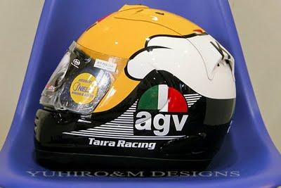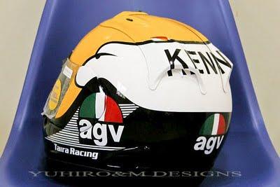 Il primo casco realizzato dalla "Yuhiro&M Designs" che ho deciso di pubblicare è un Arai Rapide SR (integrale della casa giapponese non venduto in Italia), realizzato con i colori utilizzati da Kenny Roberts sul finire degli anni '70 (con tanto di logo Agv d'annata!) e che mi ha colpito in modo particolare.