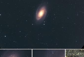 Nel pannello superiore, immagine ottenuta con la HSC in cui si vedono M81 (al centro), M82 (in alto) e NGC 3077 (in basso a sinistra). Nel pannello inferiore, è mostrato un ingrandimento di M81 (a sinistra), un ulteriore zoom che mostra il braccio a spirale di M81 (al centro) e una immagine composita usata per l’analisi dei dati (a destra). Credit: NAOJ/HSC Project