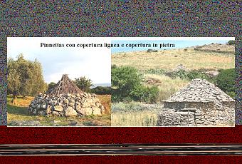 Fra gli edifici, i più semplici sono le capanne, il cui utilizzo sprofonda nel Neolitico. La tipica capanna nuragica ha pianta circolare o ellittica e struttura portante in pietra costituita da una muratura di base di circa due metri sormontata da una copertura in materiali deperibili (legno, canne, paglia), o in pietra. La forma originaria era simile a strutture ancora oggi esistenti nella loro integrità: si tratta delle pinnettas, rifugio temporaneo e deposito degli attrezzi di pastori e agricoltori.