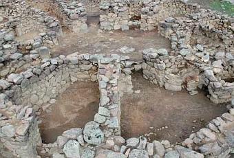Un secondo gruppo di capanne è composto da dieci vani posti intorno a uno spazio comune con pavimentazione lastricata, sopra la quale poggiava una panchina di blocchi di granito. Sono stati indagati solo cinque vani. Nello strato pavimentale sono affiorati un fondo di brocca askoide e i frammenti di un’anfora di tipo cananeo con spalla carenata e due anse a sezione circolare. Sulla spalla carenata dell’anfora, databile fra IX e VIII a.C., si sviluppa un’iscrizione composta da caratteri filistei e fenici, incisi dopo la cottura. L’iscrizione, esaminata dal Garbini, uno dei massimi esperti di filologia orientale, costituisce il documento più antico lasciato da stranieri dell’oriente mediterraneo nelle zone interne della Sardegna e indica forse la matrice linguistica del protosardo. L’anfora di tipo cananeo, derivata da esemplari in uso nei centri fenici della costa siro-palestinese, è documentata dal XII-XI a.C., ma è presente in Occidente dall’VIII a.C. L’associazione di brocche piriformi e askoidi di produzione nuragica (IX-VIII a.C.) con anfore levantine era già stata registrata nell’emporio di Sant’Imbenia di Alghero, da cui hanno preso nome le anfore da trasporto introdotte nell’isola dai traffici levantini.