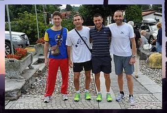 Domenica si è svolta la gara tutta in salita di 12km che porta in cima al Mottarone,io non l'avevo messa in programma e sono andato al mare a rilassarmi,ma i miei amici del Run Team (Teo,Ciccio,Giardo e Ste) hanno pensato bene di correre anche questa dopo il trail dell'Alpe Devero...non ne lasciano più una!A sentire i loro commenti è stata una bella gara con un percorso difficile ma bello,grande partecipazione di gente ed un ottimo ristoro finale più simile ad un pranzo,sono partiti insieme e dopo il primo km il buon Teo è andato in fuga essendo lui più pratico di gare in salita ma non aveva fatto i conti con i lavori svolti in settimana soprattutto il medio collinare fatto con me e Sonz ad un bel ritmo che probabilmente ha lasciato qualche strascico nelle gambe e così negli ultimi km aveva le gambe pesanti ed ha subito il sorpasso di Ciccio che dopo una prima parte corsa insieme al gemello di scarpe nuove Giardo è partito in progressione ed ha chiuso la gara in 1h15'55" per primo del gruppo dei fantastici 4!
