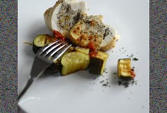 Cut vegetables into pieces of about 1,5-2 cm and salt them Open the chicken breast and regularize cutting off the extremities to form a rectangle In the chopper chop up the scraps of chicken, olives and basil Stir the mixture with Parmesan cheese and spread evenly over the chicken breasts