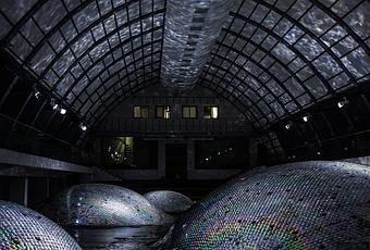 In un ambiente decisamente atipico, con un porticato ai lati ed una volta a botte a copertura, prende forma un paesaggio di morbidi rilievi, come se delle bolle d’aria stessero cercando di sollevare il pavimento. Queste non sono altro che strutture gonfiabili plastiche, la cui superficie è ricoperta da un telo su cui sono incollati 180.000 compact disc.