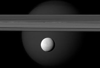 Sembra arte astratta, essenziale nelle sue linee e nei suoi contrasti, armoniosa nella composizione degli elementi. Ma la banda orizzontale è una porzione degli anelli di Saturno, a un miliardo e trecento milioni di chilometri dalla Terra, e il pallino chiaro è Encelado, una luna ghiacciata del pianeta, che si staglia contro Titano, un’altra luna saturniana che, se non fosse al guinzaglio gravitazionale del Signore degli Anelli, sarebbe considerata un pianeta (è più grande di Mercurio).