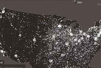 Il lavoro dei ricercatori della Stanford University è straordinario. Sulla mappa, che si può gestire e manovrare a piacimento, scorrono trecento anni di storia dell’industria editoriale e del giornalismo USA, con più di 140mila pubblicazioni. I filtri permettono di spaziare nel tempo, circoscrivere la ricerca per nazione, città, lingua (ci sono anche i giornali in italiano), frequenza della pubblicazione (quotidiani, settimanali, mensili).