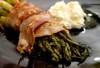 Ma quanto sono buoni gli asparagi con le uova e con la pancetta?!?! La mia non è una domanda retoricama una vera constatazione, l’abbinamento è un classico, in genere con l’uovo cotto direttamente sopra gli asparagi, o cotti in tegamino con l’uovo. E’ da questa base che son partito per rivisitare in maniera semplice il piatto, giocando un po’ sul “vestito” degli asparagi e la “camicia” del uova.Ho optato per la pancetta affumicata distesa perché trovo che il suo sapore “fumoso” si unisca in maniera ottima agli asparagi, mentre per l’uovo in camicia ho usato l’aceto di mele, un po’ meno presente e più fruttato.