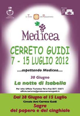 Il prossimo 7 luglio si inaugura l'edizione 2012 di MEDICEA a Cerreto Guidi! SABATO 30 GIUGNO, dalle ore 19.30, nel centro storico di Cerreto Guidi, aspettando Medicea...con "La Notte di Isabella. Atmosfere e misteri di Cerreto nel ‘500": apertura di osterie e taverne, mestieri e vita quotidiana, cantastorie, giochi, balli e musiche rinascimentali, mercatino rinascimentale ed esibizione delle contrade del Palio del Cerro. Apertura straordinaria della Villa medicea fino alle ore 23 con visite guidate.