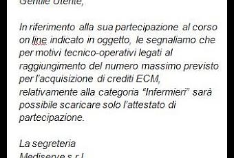 Ritengo dunque che se si vogliano ottenere i crediti ECM erogati da un corso, sia utile svolgere lo stesso con una certa velocità, in modo da rientrare in quel numero di posizioni a cui i crediti vengono assegnati. In caso contrario, come è accaduto ai colleghi di cui sopra, ci si dovrà "accontentare" del materiale didattico e di un attestato di partecipazione.... Staremo a vedere