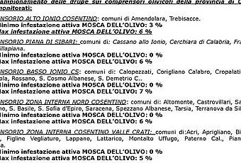 Il bollettino, relativo alla provincia di COSENZA, fornisce informazioni sullo stato delle infestazioni dei parassiti dell'olivo e dispensa consigli fitopatologici sulla scorta delle osservazioni effettuate nelle aziende monitorate.