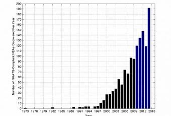 Gli asteroidi scoperti ogni anno grazie al Near Earth Object Human Spaceflight Accessible Targets Study. Crediti: NASA / GFSC / Brent Barbee.