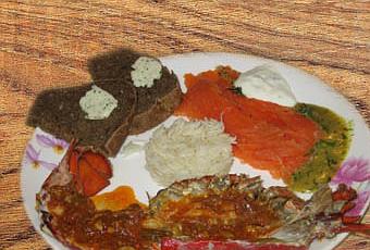 Facciamo restringere qualche minuto e impiattiamo: astice, del riso pilaf bianco come accompagnamento, e sopra l'astice una dose abbondante di sughetto, e se abbiamo un'occasione VERAMENTE SPECIALE, e avete voglia di fare qualcosa di VERAMENTE SPECIALE al prezzo di un pò di lavoro in più, impiattate come ho fatto io: astice all'armoricaine, salmone marinato svedese con salsina gravad lax e panna acida, pane nero con due gocce di burro aromatizzato all'aneto fatto in casa. Veramente un tocco gourmet a casa propria e ....godetevi le scintille del dopo cena!!!!